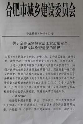 為進一步提高保障性住房建設的質量安全管理水平,,,,,,,,加強對保障性住房各方建設主體質量行為、實體質量和施工安全的監管,,,,,,,,日前,,,,,,,,合肥市建委組織開展了全市保障性安居工程質量安全監督執法檢查。。。。。。。